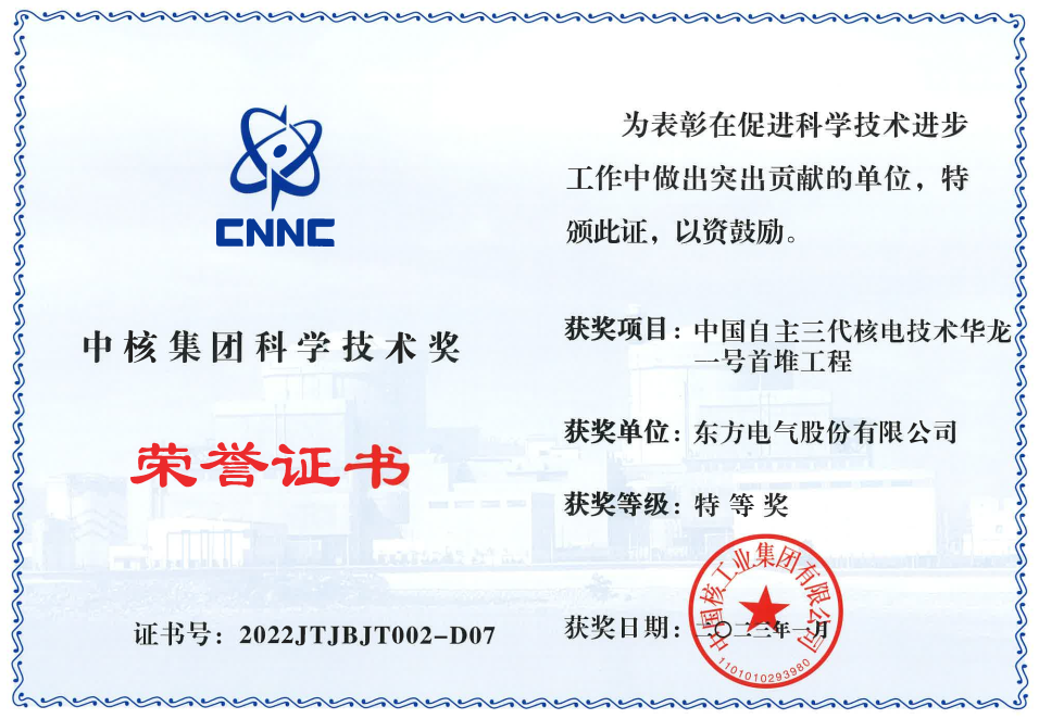 华龙一号全球首堆示范工程中核集团福清5、6号机组分别于2021年1月30日、2022年3月25日在福清核电厂投入商业运行,机组额定出力超过合同保证值,各项关键设计参数均满足设计要求,总体技术达到世界先进水平。鉴于在“中国自主三代核电技术华龙一号首堆工程”研发和供货工作中的突出贡献,近日,Z6尊龙电气荣获中核集团科学技术奖特等奖。